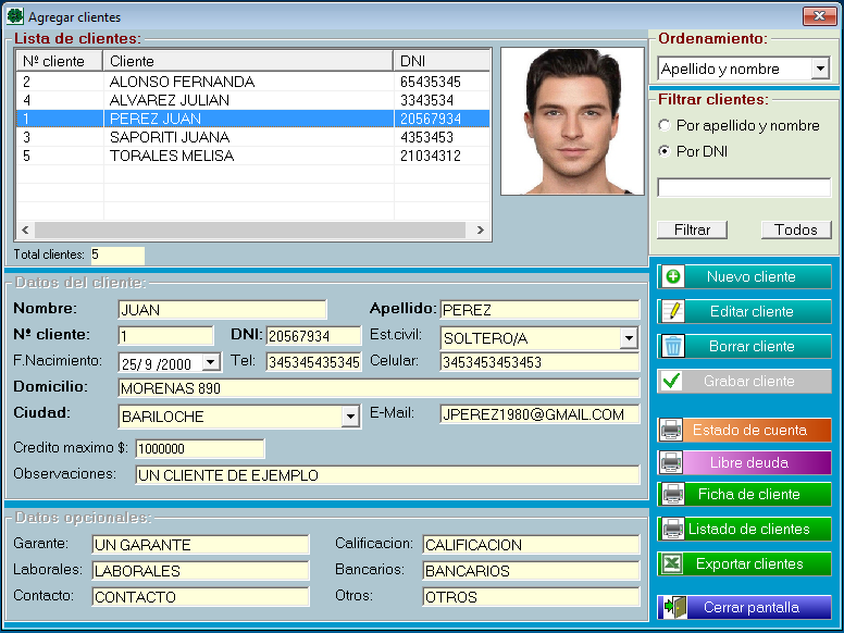 Entre los datos personales de cada cliente figuran el nombre, apellido, telefono, limite de crédito etc.